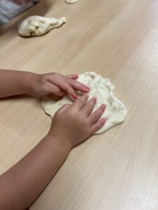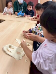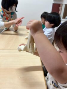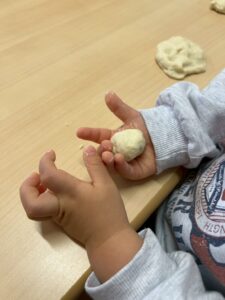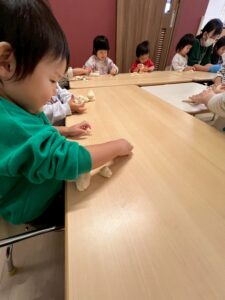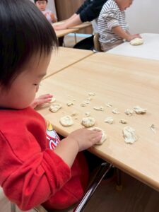 1歳児です。この日は「小麦粉粘土遊び」。やさしい感触に集中してあそぶ子どもたちです。