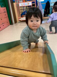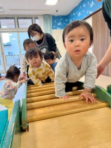 0歳児さんです。この日は遊戯室で運動あそび!手足を使って様々な動きを楽しんでいます。