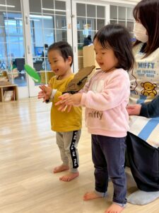 2歳児です。子どもたちが大好きなわらべ歌あそび。歌に合わせながら保育士手作りのでんでん太鼓を、手のひらを使って回しています。