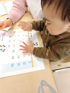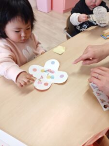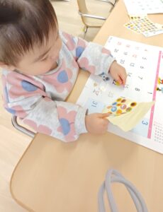 0歳児のお友だちがシール貼り遊びを楽しむ様子が見られました。